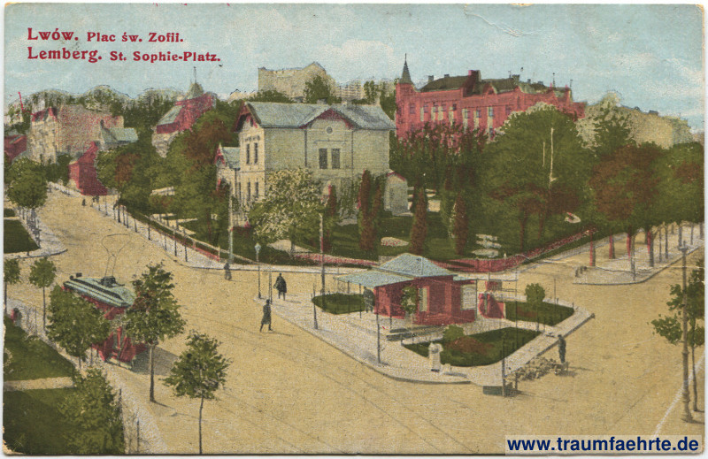 Postcard St Sophie Squ / plac św. Zofii (today near Ivana Franka Squ / Ploshcha Ivana Franka) in Lviv / Lwów / Lemberg [ Permalink ]Keywords: Squares, Trams, Pavilions, Lanterns, Alleys, Rails, Towers, Military Mail, World War I, Galicia