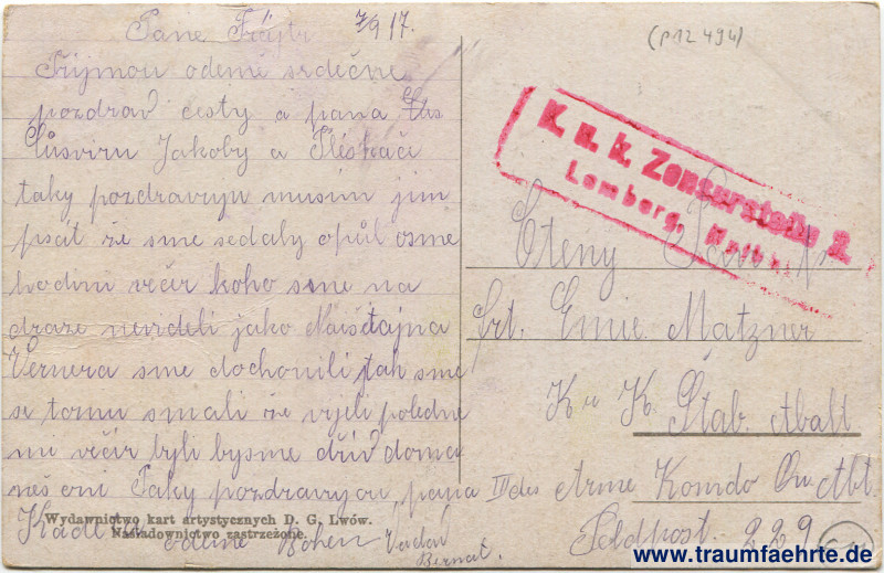– Details – Year: ca. 1915 Postal state: postally used without stamp (military mail), 1917 Inscription front: Lwów. Plac św. Zofii. Lemberg. St. Sophie-Platz. Inscription back: Wydawnictwo kart artystycznych D. G. Lwów. Naśladownictwo zastrzeżone. Postmark(s): K. u. k. Zensurstelle 2, Lemberg, [Hptbhf.] Please note: