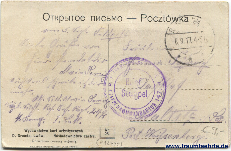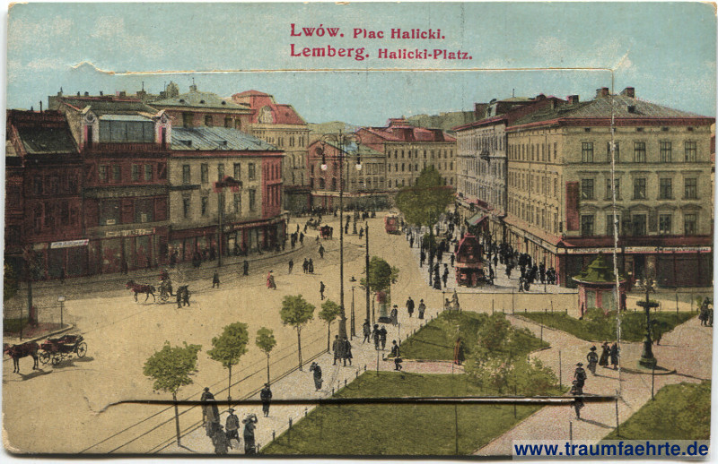 – Details – Jahr: ca. 1915 Status: gelaufen ohne Briefmarke (Feldpost), 1917 Beschriftung vorne: Lwów. Plac Halicki. Lemberg. Halicki-Platz. [Laporello:] Dworzec kolejowy. – Bahnhof. / Plac Akademicki. – Akademieplatz. / Kościół św. Elżbiety. – St. Elisabethkirche. / Ul. Grodecka. – Grodeckagasse. / Rynek. – Ringplatz. / Ul. Karola Ludwika z ul. Sykstuską. Karl Ludwig- und Sikstuska-Gasse. / Ul. Trzeciego Maja. – Dritte Maigasse. / Politechnika. – Technische Hochschule. Beschriftung hinten: Открытое письмо – Pocztówka, Wydawnictwo kart artystycznych, D. Grunda, Lwów. Naśladownictwo zastrz. Dozwolono cencurą wojenną. Drukarnia Jakubowskiego i SP. we Lwowie. Nr. 25. Stempel: Kaiserlich deutsche Etappenkommandantur 147, Brief-Stempel; Deutsche Feld[post…], -6.9.17. 4–5N Hinweis: