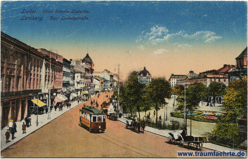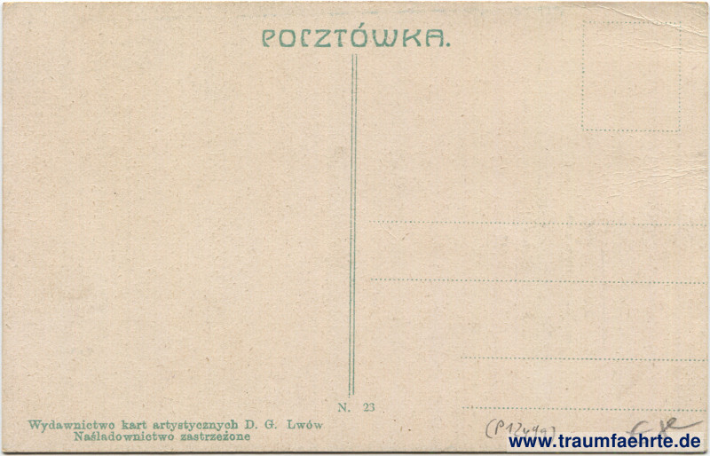 – Details – Year: ca. 1915 Postal state: postally unused Inscription front: Lwów. Ulica Karoia Ludwika. Lemberg. Karl Ludwigstraße. Inscription back: Pocztówka. Wydawnicto kart artystycznych D. G. Lwów, Naśladownictwo zastrzeżone, N. 23 Postmark(s): none Please note: