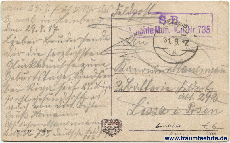 – Details – Jahr: 1917 Status: gelaufen ohne Briefmarke (Feldpost), 1917 Beschriftung vorne: Lwów, Ul. Karola Ludwika i róg Jagielllońskiej. Lemberg, Carl-Ludwig-Straße u. Ecke Jagielloner-Gasse. Beschriftung hinten: Wydawnictwo Sztuka Kraków, Déposé 1917. No. 4. 93888 Stempel: K. D. Feldpost, a, 31.8.17; S. B. Leichte Mun.-Kal. Nr. 735 Hinweis: