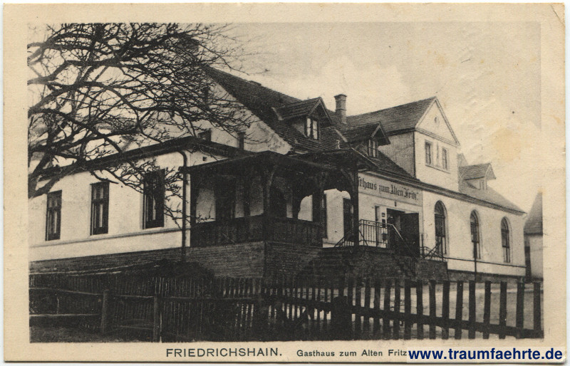 – Details – Year: ca. 1915 Postal state: postally used without stamp (military mail), Inscription front: Friedrichshain. Gasthaus zum Alten Fritz. Gasthaus zum Alten Fritz. Inscription back: Verlag B. Dressler, Reichenbach i. Schles. Postmark(s): Steinseifersdorf, * […] *, 6 / 6 16 Please note: