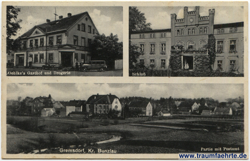 – Details – Jahr: ca. 1930 Status: gelaufen 1933 Beschriftung vorne: Gremsdorf, Kr. Bunzlau, Oehlke's Gasthof und Drogerie, Schloß, Partie mit Postamt Beschriftung hinten: Gremsdorf, Kr. Bunzlau, Oehlke's Gasthof und Drogerie, Fernruf 230, Franz Streitenberger, Ansichtspostkarten-Verlag, Stephansdorf – Bez. Breslau Stempel: […] (Bez. Liegnitz), * a, 15.8.33. 3–4N Hinweis:
