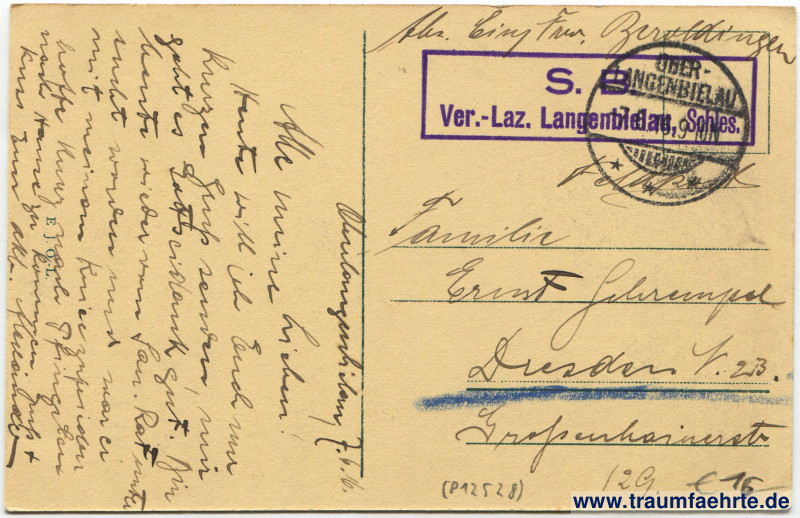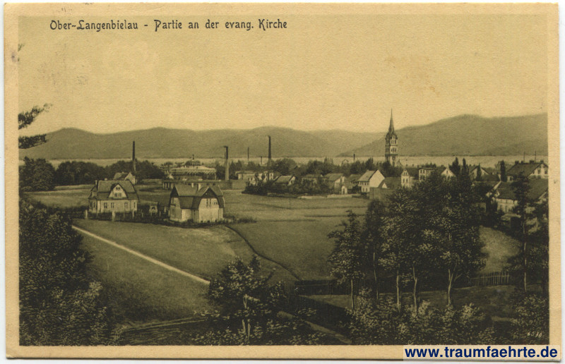– Details – Jahr: ca. 1915 Status: gelaufen ohne Briefmarke (Feldpost), 1916 Beschriftung vorne: Ober-Langenbielau – Partie an der evang. Kirche Beschriftung hinten: E. J. O. L. Stempel: S. B. Ver.-Laz. Langenbielau, Schles.; Ober-Langenbielau, * * *, 7.6.16 9–10 N Hinweis: