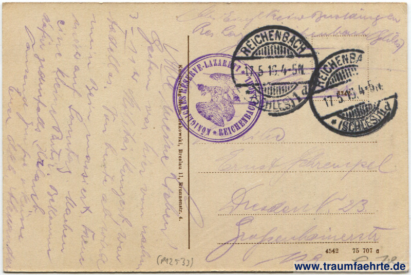 Stempel: Königliches Reserve-Lazarett Reichenbach i. Schl.; 2x Reichenbach (Schles.), * 1 a, 17.5.16 4–5N