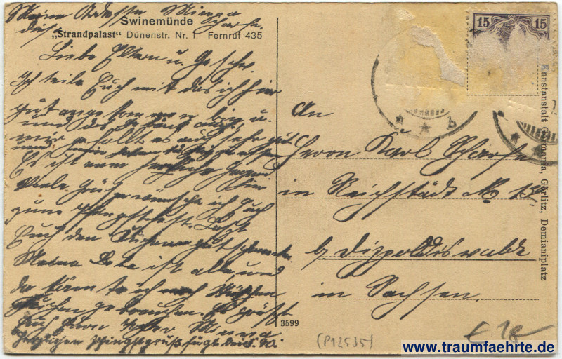Beschriftung hinten: Swinemünde, „Strandpalast“ Dünenstr. Nr. 1. Fernruf 435, Kunstanstalt Germania, Görlitz, Demianiplatz, 3599