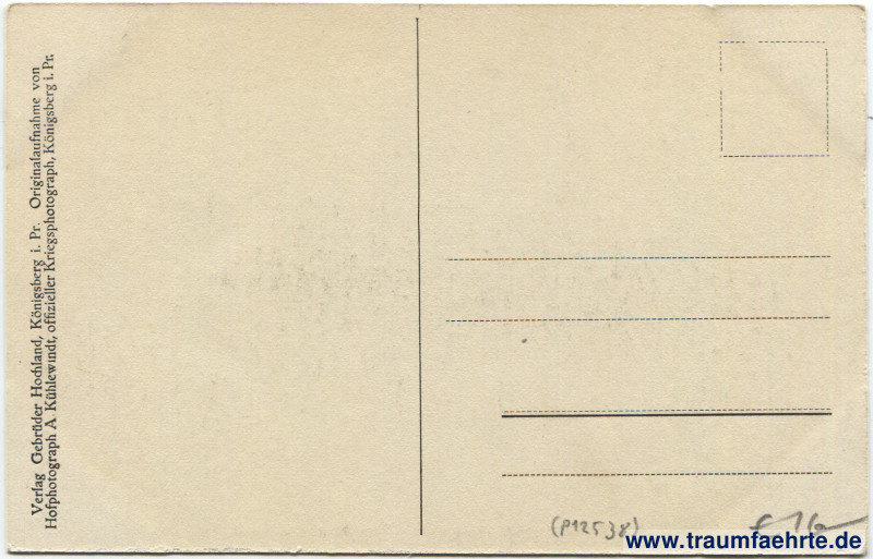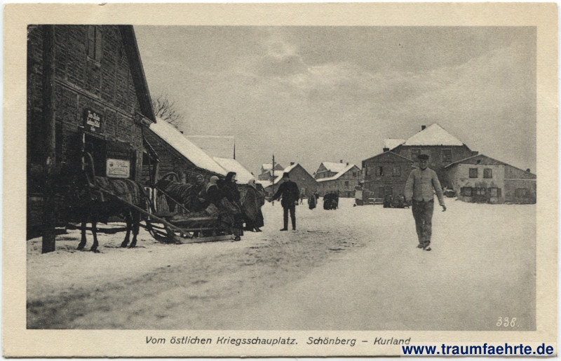 – Details – Jahr: ca. 1915 Status: ungelaufen Beschriftung vorne: Vom östlichen Kriegsschauplatz. Schönberg – Kurland, 336 Beschriftung hinten: Verlag Gebrüder Hochland, Königsberg i. Pr. Originalaufnahme von Hofphotograph A. Kühlewindt, offizieller Kriegsphotograph, Königsberg i. Pr. Stempel: keine Hinweis: