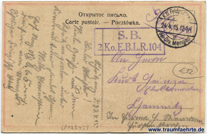 – Details – Jahr: ca. 1910 Status: gelaufen ohne Briefmarke (Feldpost), 1915 Beschriftung vorne: Лодзь, Калищскій Вокзалъ. Łódź, Dworzec Kaliski. Lodz, Kalischer Bahnhof. Beschriftung hinten: Открытое письмо. Carte postale. – Pocztówka. Stempel: S. B. 2 Ko. E.B.L.R. 104, K. D. Feldpostexp. der Div. Menges, a, 24.4.15. 12–1N. Hinweis: