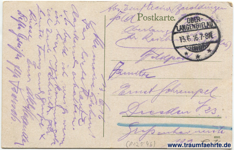 – Details – Jahr: ca. 1915 Status: gelaufen ohne Briefmarke (Feldpost), 1916 Beschriftung vorne: Gruss aus dem Eulengebirge. Kaiser Wilhelmshöhe. Verlag von Paul Burghardt, Kaiser Wilhelmshöhe b. Ober-Langenbielau. Schles. Beschriftung hinten: Postkarte. 6591 Stempel: Ober-Langenbielau, * * *, 13.6.16. 7–8N. Hinweis: