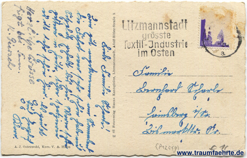 Beschriftung hinten: A. J. ostrowski, Kom.-V. A. Hahn, g 82 Fotoverlag Hanns Kanngießer, Litzmannstadt, Adolf-Hitler-Straße 5