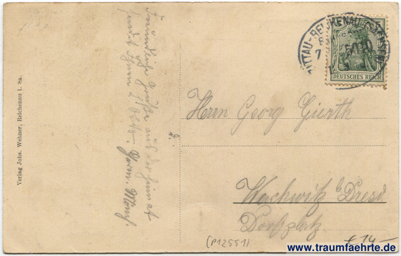 – Details – Jahr: ca. 1905 Status: gelaufen 1910 (Bahnpost) Beschriftung vorne: Reichenau i. Sa. Haus Hauptmann. Beschriftung hinten: Verlag Johs. Wehner, Reichenau i. Sa. Stempel: Zittau–Reichenau (Sachsen), Bahnpost, Zug 5010, […]3.10. Hinweis: