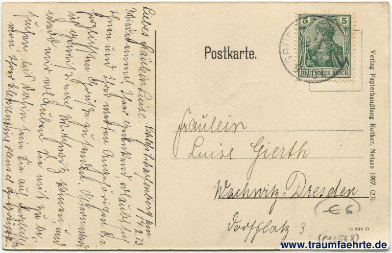 – Details – Jahr: 1907 Status: gelaufen 1913 Beschriftung vorne: Neisse, Kreuzkirche u. Realgymnasium Beschriftung hinten: Postkarte. Verlag Papierhandlung Rother, Neisse 1907. (23). 15 595 O Stempel: Grü[…], [18.9.13] 9–10V. Hinweis:
