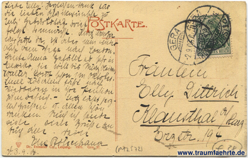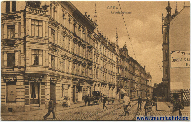 – Details – Jahr: 1905 Status: gelaufen 1907 Beschriftung vorne: Gera, Leipzigerstrasse, Conditorei & Café, Conditorei & Café Gustav Kanis, Conditorei & Café, Firm[…] Special-Ges[…] Hie[…],… Beschriftung hinten: Postkarte. D T Co, Dr. Trenkler Co., Leipzig. 1905 Gra. 27 Stempel: keine Hinweis:
