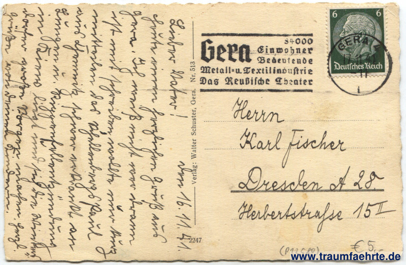 Postmark(s): Gera, 84000 Einwohner, Bedeutende Metall- u. Textilindustrie, Das Reußische Theater; Gera 4, i, 17.11.41, –11