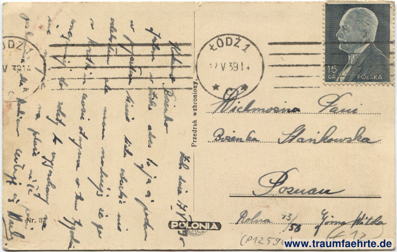 Postmark(s): 2x Łódź 1, * c *, 12.V.39 14; –––