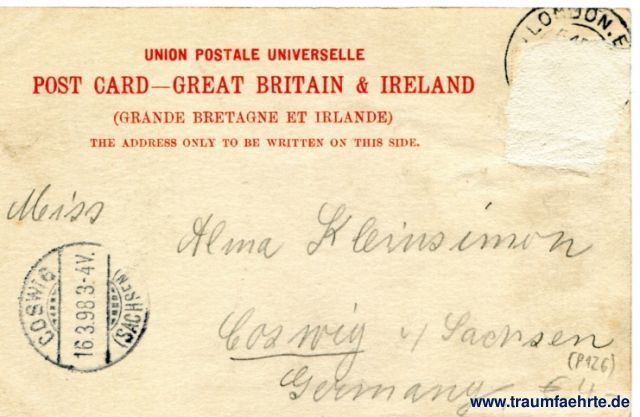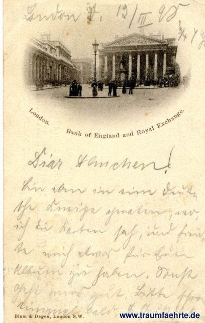 – Details – Jahr: ca. 1895 Status: gelaufen 1898, Briefmarke entfernt Beschriftung vorne: London. Bank of England and Royal Exschange. Blum & Degen, London S.W. Beschriftung hinten: Union Postale Universelle, Post Card – Great Britain & Ireland, (Grande Bretagne et Irlande), The address only to be written on this side. Stempel: London.(...); Coswig (Sachsen), 16.3.98.3-4V. Hinweis: