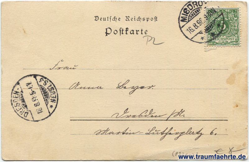 Postmark(s): Misdroy, * * *, 16.8.98 9–10N; Dresden-Neust. 8, * 3, 18.8.98 5–6V