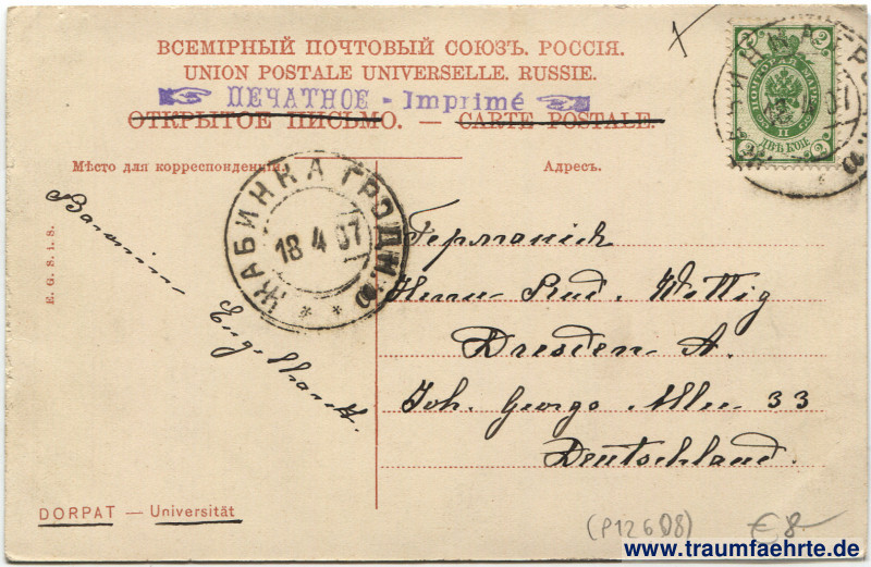 – Details – Jahr: ca. 1905 Status: gelaufen 1907 Beschriftung vorne: kein Text Beschriftung hinten: Всемірный почтовый союз, Риссія. Union postale universelle. Russie. Открытое письмо. – Carte postale. Dorpat – Universität, Мѣсто для корреспонденція. Адресъ. E. G. S. i. S. Stempel: Печатное – Imprimé; 2x Жабинка гродн. […], 18 4 07 Hinweis:
