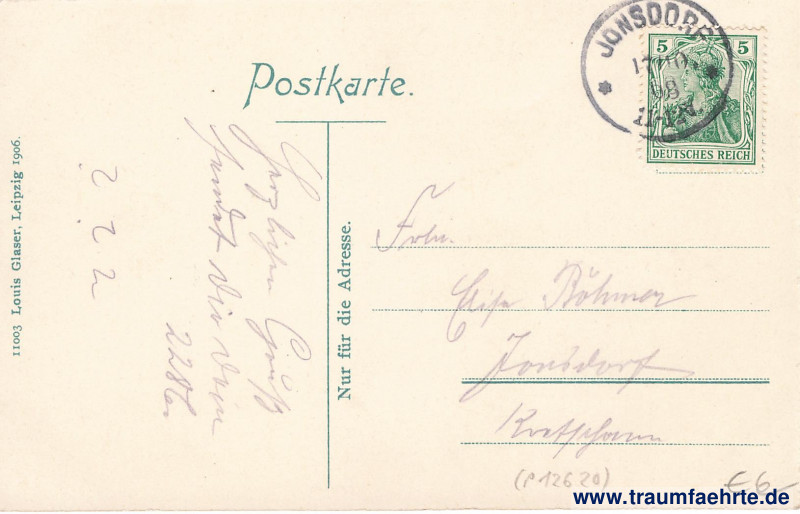 – Details – Jahr: 1906 Status: gelaufen 1908 Beschriftung vorne: Jonsdorf. Blick v. d. Gondelfahrt n. d. Nonnenfelsen. Beschriftung hinten: 11003 Louis Glaser, Leipzig 1906. Postkarte. Nur für die Adresse. Stempel: Jonsdorf, *, 17/10 08 11–12V Hinweis: