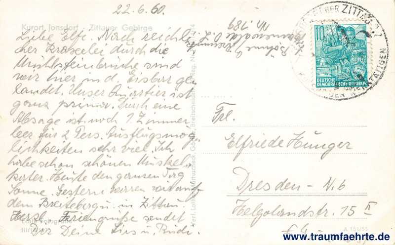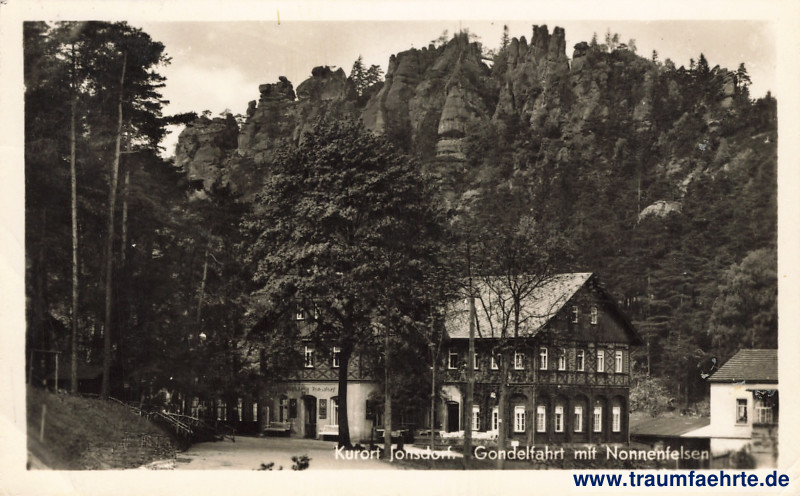 – Details – Jahr: ca. 1955 Status: gelaufen 1960 Beschriftung vorne: Kurort Jonsdorf. Gondelfahrt mit Nonnenfelsen. Beschriftung hinten: Kurort Jonsdorf – Zittauer Gebirge, Echte Fotografie, III/18/107, Verl. Lothar Mattuscheck, Görlitz, Breitscheidstr. 10. Reg. Nr. FIII/14/14, A 151/55 Stempel: Jonsdorf über Zittau, Kurort der Werktätigen, […] Hinweis: