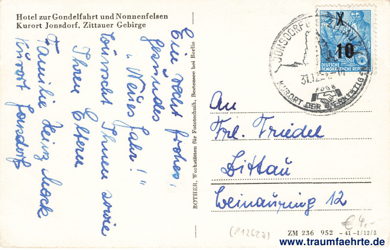 Beschriftung hinten: Hotel zur Gondelfahrt und Nonnenfelsen, Kurort Jonsdorf, Zittauer Gebirge, ROTHER, Werkstätten für Fototechnik, Bestensee bei Berlin, ZM 236 952 – 41 –I/12/5