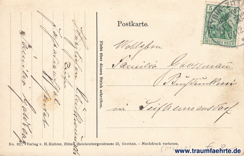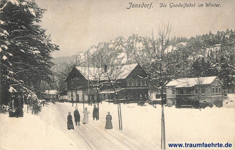 – Details – Jahr: ca. 1905 Status: gelaufen 19?? (Bahnpost) Beschriftung vorne: Jonsdorf. Die Gondelfahrt im Winter. Beschriftung hinten: No. 917. Verlag v. H. Richter, Zittau. Reichenbergstrasse 22, Grottau. – Nachdruck verboten. Postkarte. Nicht über diesen Strich schreiben. Stempel: Bahnpost Zug 503, Oybin – Zitt[au], 31 12 […] Hinweis: