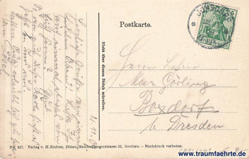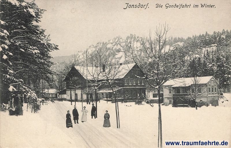 – Details – Jahr: ca. 1905 Status: gelaufen 1909 Beschriftung vorne: Jonsdorf. Die Gondelfahrt im Winter. Beschriftung hinten: No. 917. Verlag v. H. Richter, Zittau. Reichenbergstrasse 22, Grottau. – Nachdruck verboten. Postkarte. Nicht über diesen Strich schreiben. Stempel: Jonsdorf, *, 22.11.09, 11–12V. Hinweis: