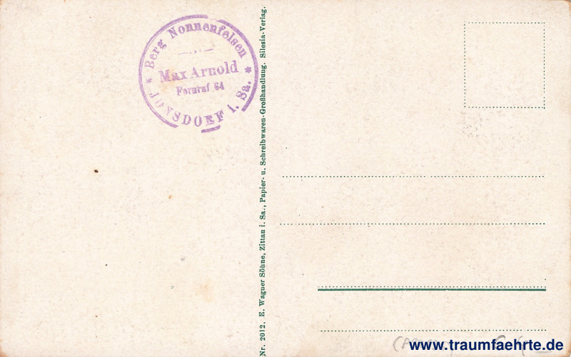 – Details – Jahr: ca. 1915 Status: ungelaufen Beschriftung vorne: Jonsdorf. Nonnenfelsentreppe. Beschriftung hinten: Nr. 2012. E. Wagner Söhne, Zittau i. Sa., Papier- u. Schreibwaren-Großhandlung. Silesia-Verlag. Stempel: keine Hinweis: