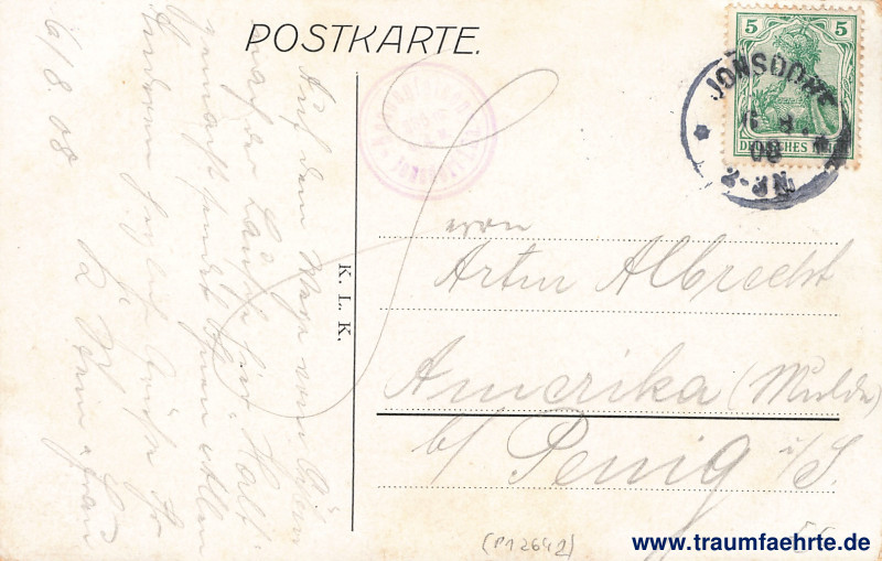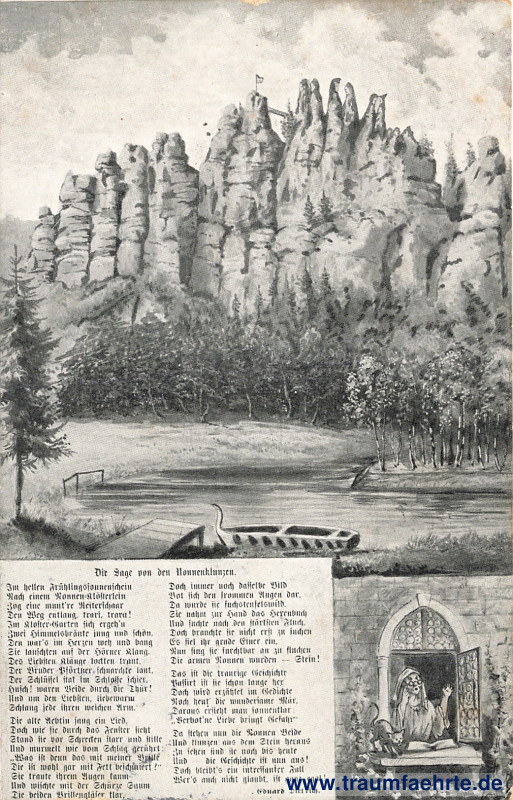 – Details – Year: ca. 1905 Postal state: postally used 1908 Inscription front: Die Sage von den Nonnenklunzen. Im hellen Frühlingssonnenschein / Nach einem Nonnen-Klösterlein / Zog eine munt're Reiterschaar / Den Weg entlang, trari, trara! / Im Kloster-Garten sich ergeh'n / Zwei Himmelsbräute jung und schön, / Den war's im Herzen weh und bang / Sie lauschtren auf der Hörner Klang. / Des Liebsten Klänge lockten traut, / Der Bruder Pförtner schnarchte laut, / Der Schlüssel stak im Schlosse schier, / Husch! waren Beide durch die Thür! / Und um den Liebsten, liebewarm / Schlang jede ihren weichen Arm. // Die alte Aebtin sang ein Lied, / Doch wie sie durfch das Fenster sieht / Stand sie vor Schrecken starr und stille / Und murmelt wie vom Schlag gerührt: / „Was ist denn das mit meiner Brille / Die ist wohl gar mit Fett beschmiert?“ / Sie traute ihrem Augen kaum / Und wischte mit der Schütze Saum / Die beiden Brillengläser klar, / Doch immer noch dasselbe Bild / Bot sich den frommen Augen dar, / Da wurde sie fuchsteufelswild. / Sie nahm zur Hand das Herrenbuch / Und suchte nach dem stärksten Fluch. / Doch brauchte sie nicht erst zu suchen / Es fiel ihr grade Einer ein, / Nun fing sie furchtbar an zu fluchen / Die armen Nonnen wurden – Stein! // Das ist die traurige Geschichte / Passirt ist sie schon lange her, / Doch wird erzählet im Gedichte / Noch heut die wundersame Mär, / Daraus ersieht man sonnenklar: / „Verbot'ne Liebe bring Gefahr“ // Da stehen nun die Nonnen Beide / Und klunzen aus dem Stein heraus / Zu sehen sind sie noch bis heute / Und – die Geschichte ist nun aus! / Doch bleibt's ein intressanter Fall / Wer's auch nicht glaut, ist ganz egal! // Eduard Dietrich. Inscription back: Postkarte. K. L. K. Postmark(s): Jonsdorf, *, 6.8.08, 2–3 N.; Nonnenfelsen, Jonsdorf i. Sa., 536 m ü. d. M. Please note: