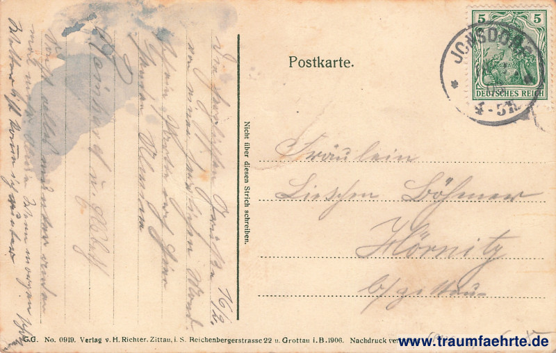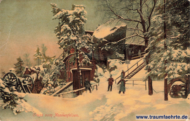 – Details – Jahr: 1906 Status: gelaufen 1908 Beschriftung vorne: Gruss vom Nonnenfelsen. Beschriftung hinten: Postkarte. Nicht über diesen Strich schreiben. G.G. No. 0919. Verlag v. H. Richter, Zittau i. S. Reichenbergerstrasse 22 u. Grottau i. B. 1906. Nachdruck verboten. Stempel: Jonsdorf, *, 18 [3?] 08, 4–5N. Hinweis: