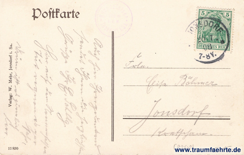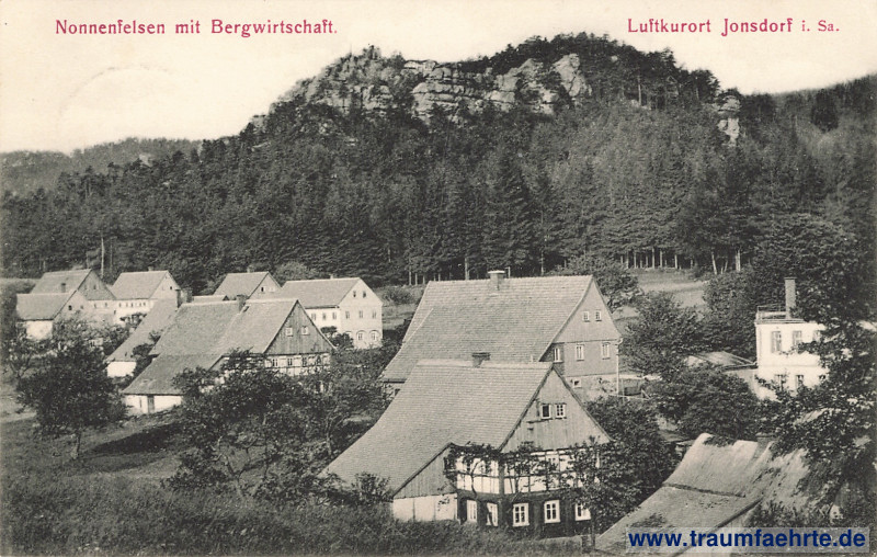 – Details – Year: ca. 1905 Postal state: postally used 1908 Inscription front: Nonnenfelsen mit Bergwirtschaft. Luftkurort Jonsdorf i. Sa. Inscription back: Postkarte, Verlag: W. Mehr, Jonsdorf i. Sa. 11 830 Postmark(s): Jonsdorf, 20 7. 08, 7–8V.; Nonnenfelsen, * *, Jonsdorf i. Sa., 536 m ü. d. M. Please note: