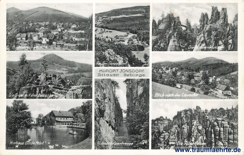 Inscription front: Kurort Jonsdorf. Zittauer Gebirge. Buchberg u. Lausche, Die Orgel mit der Lausche, Kurhaus Gondelfahrt, An der Gondelfahrt, Nonnenfelsentreppe, Die Nonnenklunzen, Blick nach der Lausche, Die Albertfelsen