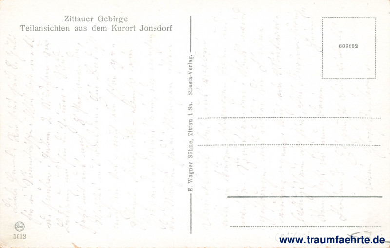 Inscription back: Zittauer Gebirge, Teilansichten aus dem Kurort Jonsdorf, Silesia, 5612, E. Wagner Söhne, Zittau i. Sa. Silesia-Verlag. 609602