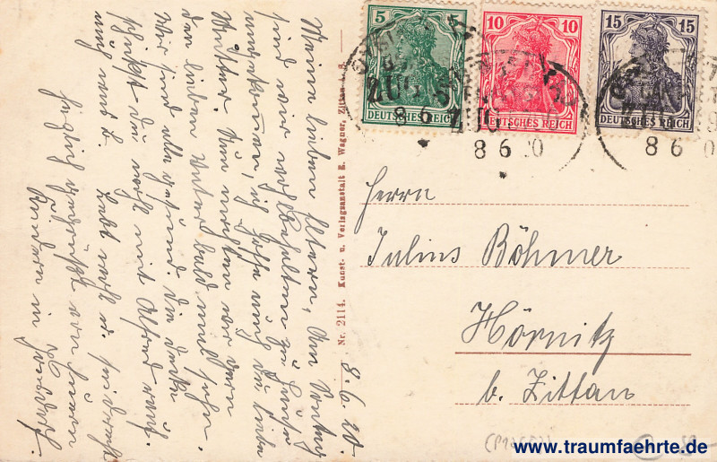 – Details – Year: ca. 1915 Postal state: postally used 1920 (rail mail) Inscription front: Jonsdorf. Inscription back: Nr. 2114. Kunst- u. Verlagsanstalt E. Wagner, Zittau i. S. Postmark(s): 3x Oybin – Zittau, Bahnpost, Zug 5900, 8 6 20 Please note: