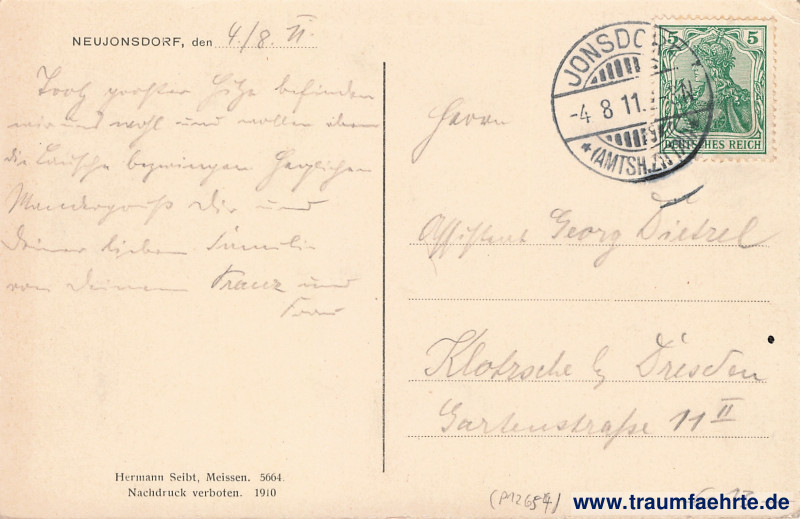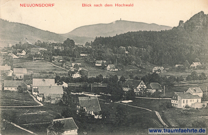 – Details – Jahr: 1910 Status: gelaufen 1911 Beschriftung vorne: Neujonsdorf, Blick nach dem Hochwald Beschriftung hinten: Neujonsdorf, den …, Hermann Seibt, Meissen. 5664. Nachdruck verboten. 1910 Stempel: Jonsdorf (Amtsh. Zittau), * *, –4 8 11. 2–3N Hinweis:
