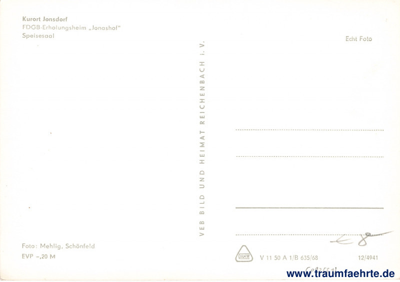 Beschriftung hinten: Kurort Jonsdorf, FDGB-Erholungsheim „Jonashof“, Speisesaal, Foto: Mehlig, Schönfeld, EVP –,20 M, VEB Bild und Heimat Reichenbach i. V. Echt Foto, DAMW, V 11 50 A 1/B 635/68, 12/4941