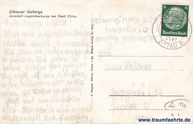 Beschriftung hinten: Zittauer Gebirge, Jonsdorf-Jugendherberge der Stadt Zittau, E. Wagner Söhne, Zittau i. Sa. Silesia-Verlag Nr. 3347, b 2