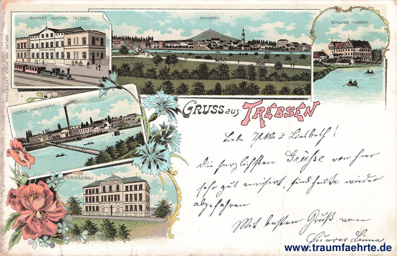 Inscription front: Gruss aus Trebsen, Bahnhof Nerchau-Trebsen, Kolmberg, Schloss Trebsen, Wiede's Papierfabrik. Bürgerschule