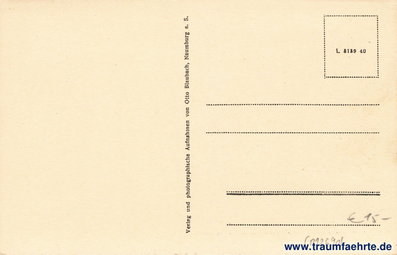 – Details – Year: ca. 1940 Postal state: postally unused Inscription front: Gruß aus Rohrbach, Gasthof, Rittergut, Kriegerdenkmal, Partie an der Kirche, Gasthof Rohrbach Inscription back: Verlag und photographische Aufnahme von Otto Blaubach, Naumburg a. S., L [3]139 40 Postmark(s): none Please note: