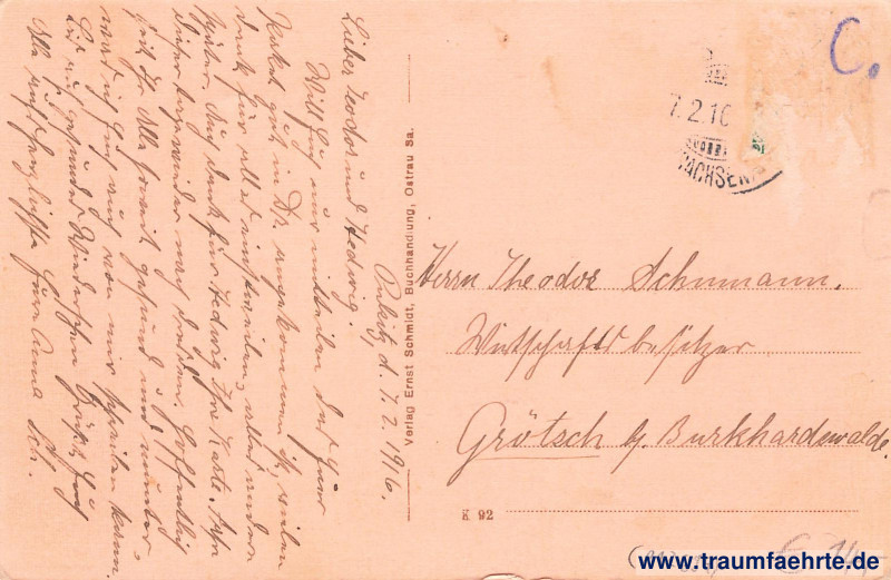 Inscription back: Verlag Ernst Schmidt, Buchhandlung, Ostrau Sa., K 92