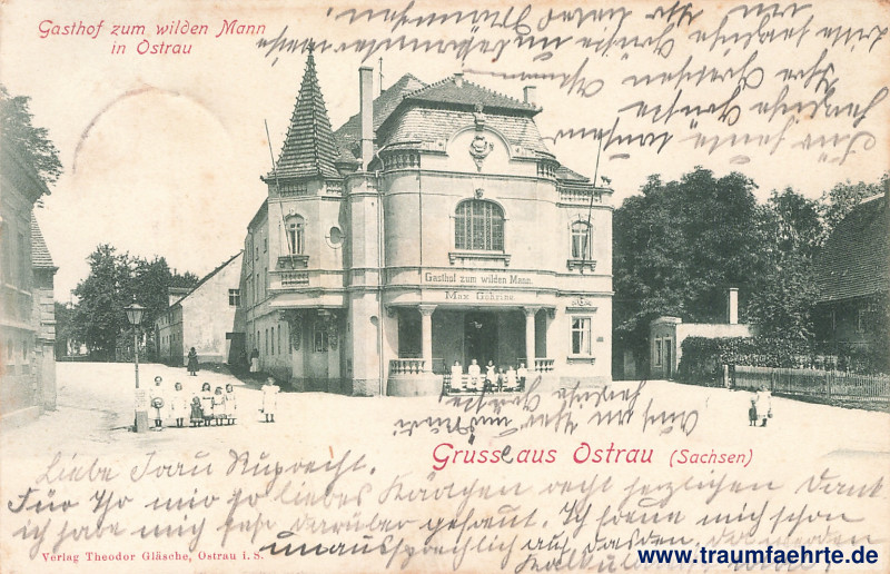 Beschriftung vorne: Gruss aus Ostrau (Sachsen), Gasthof zum wilden Mann in Ostrau, Verlag Theodor Gläsche, Ostrau i. S., Gasthof zum wilden Mann. Max Göhring.