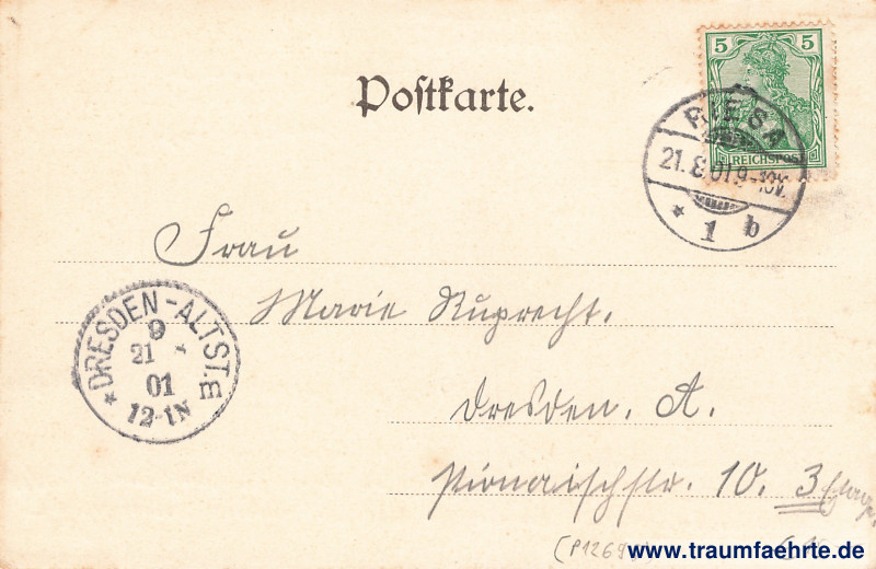 Stempel: Riesa, * 1 b, 21.8.01.9–10V.; Dresden-Altst. 9, * m,21 8 01 12–1N