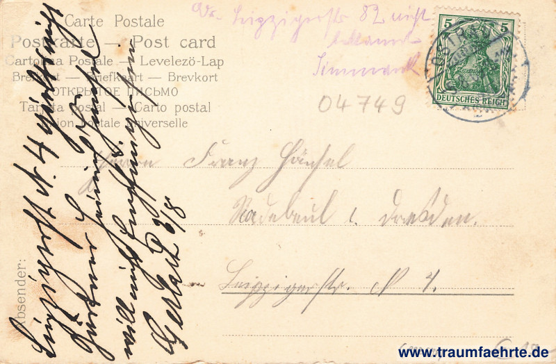 – Details – Jahr: ca. 1905 Status: gelaufen 1909 Beschriftung vorne: Gruss aus Ostrau i. S. Bahnhofstrasse, Verlag Theodor Gläsche 153, Ostrau i. S. Beschriftung hinten: Carte Postale, Postkarte – Post card, Cartolina Postale – Levelezö-Lap, Brefkort – Briefkaart – Brevkort, Открытое письмо, Tarjeta postal – Carto postal, Union Postale Universelle, Absender: … Stempel: Ostrau […], –5.8.09 10–11N. Hinweis: