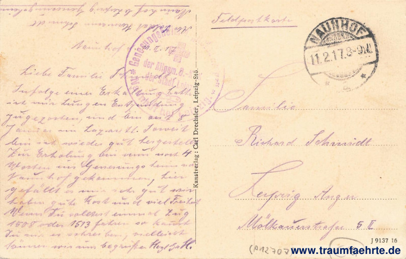 – Details – Jahr: ca. 1915 Status: gelaufen ohne Briefmarke (Feldpost), 1917 Beschriftung vorne: Naunhof, Hainstrasse Beschriftung hinten: Kunstverlag: Carl Drechsler, Leipzig-Stö. J 9137 16 Stempel: Naunhof, * a *, 11.2.17. 8–9N; Genesungsheim v. „Roten Kreuz”, Naunhof bei Leipzig, der Allg. O.-K[…]K der Stadt Leipzig Hinweis: