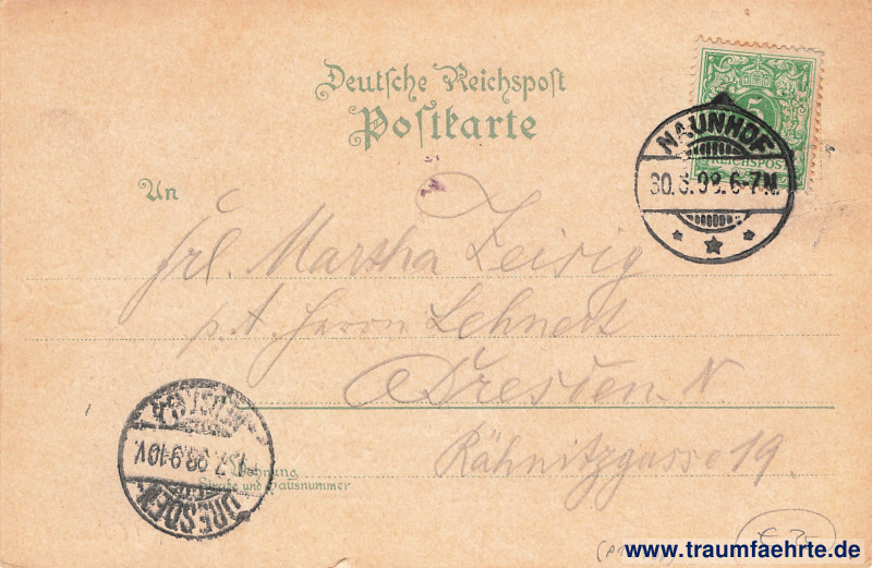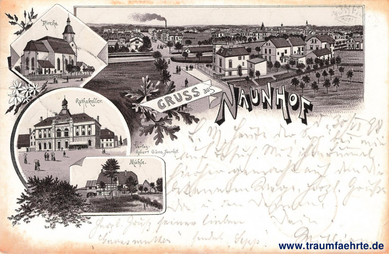 – Details – Jahr: ca. 1895 Status: gelaufen 1898 Beschriftung vorne: Gruss aus Naunhof, Kirche, Ratskeller. Mühle. Verlag: Robert Günz, Naunhof. Beschriftung hinten: Deutsche Reichspost, Postkarte, An … in … Wohnung (Straße und Hausnummer) … Stempel: Naunhof, * * *, 30.3.98; Dresden-Neust. 6, [h], 1.7.98. 9–10V. Hinweis: