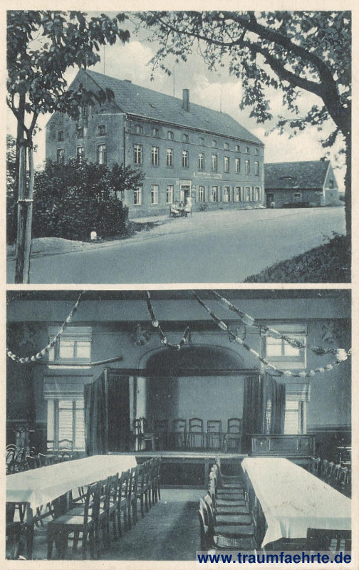 bläuliche Schwarzweißfotografie mit zwei Ansichten – 1.) Gasthof mit Schild, Haus, Strauch und Bäumen, davor sitzende Menschen, 2.) Innenansicht des Gasthauses mit gedeckten Tischen, Stühlen, Bühne, Vorhängen, Fenstern und Girlanden