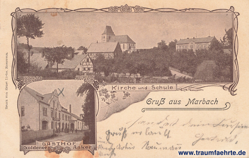 Beschriftung vorne: Gruß aus Marbach, Kirche und Schule, Gasthof Goldener Anker. Druck von Ernst Liebe, Rosswein.
