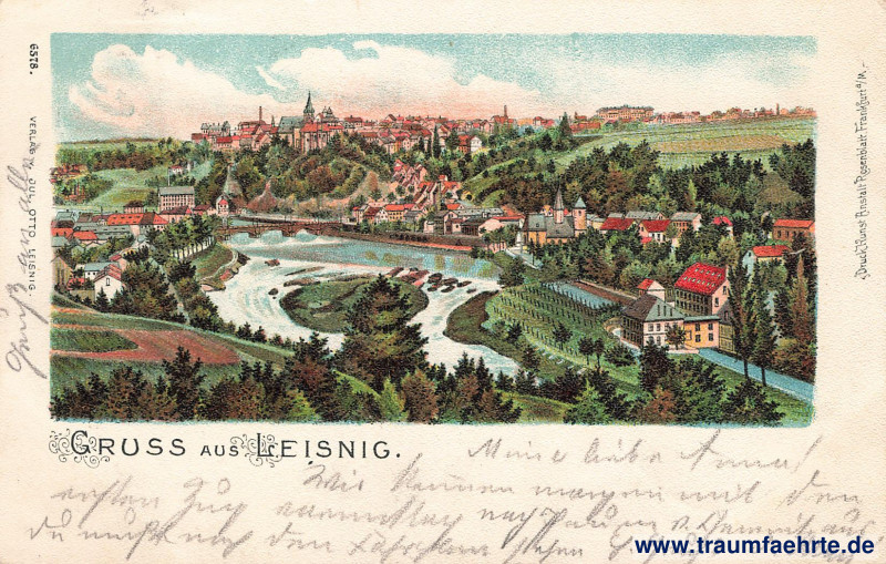 – Details – Jahr: ca. 1900 Status: gelaufen 1902 Beschriftung vorne: Gruss aus Leisnig. 6578. Verlag v. Jul. Otto, Leisnig. Druck Kunst Anstalt Rosenblatt Frankfurt a/M. Beschriftung hinten: Postkarte. An … Stempel: Döbeln, * [2 e], 17.3.02. 7–8N; Plauen (Vogtl.), m, 18.9.02 4–5V. Hinweis: