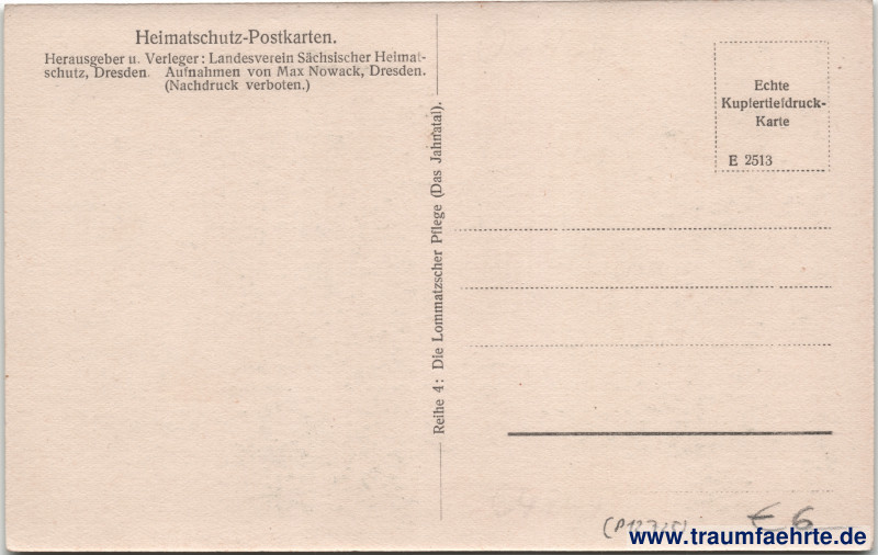 – Details – Jahr: ca. 1920 Status: ungelaufen Beschriftung vorne: Kirche zu Jahna b. Ostrau i. S. Beschriftung hinten: Heimatschutz-Postkarten. Herausgeber u. Verleger: Landesverein Sächsischer Heimatschutz, Dresden. Aufnahmen von Max Nowack, Dresden. (Nachdruck verboten.) Reihe 4: Die Lommatzscher Pflege (Das Jahnatal). Echte Kupfertiefdruck-Karte, E 2513 Stempel: keine Hinweis:
