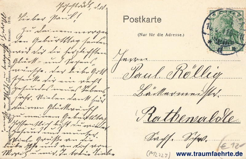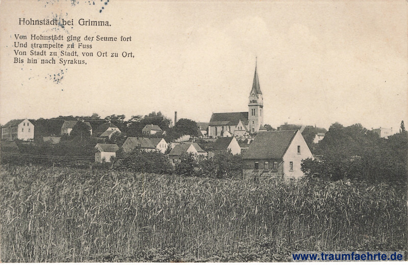 – Details – Jahr: 1910 Status: gelaufen 1911 Beschriftung vorne: Hohnstädt bei Grimma. Von Hohnstädt ging der Seume fort / Und strampelte zu Fuss / Von Stadt zu Stadt von Ort zu Ort, / Bis hin nach Syrakus. Beschriftung hinten: Postkarte, (Nur für die Adresse.), Eigentum u. Verlag: Bernhard Braun, Grimma, Ecke Lange- u. Kreuzstr. 1910. 9853 Stempel: Grimma, * d *, 10.[2.]11. 6–7N. Hinweis: